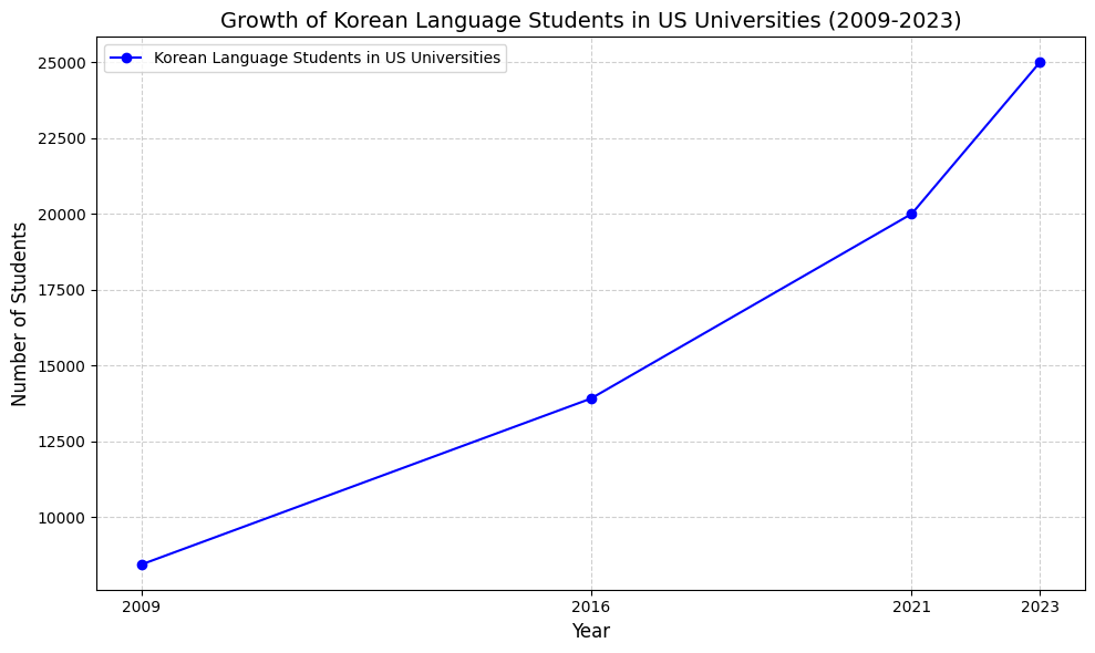 2009년 미국 대학에서 한국어를 배우는 학생 수는 약 8,449명이었으나, 2023년에는 25,000명으로 약 3배 증가했습니다. 이는 한류 열풍과 함께 한국 문화에 대한 관심이 높아진 결과입니다. 아래 그래프는 미국 대학에서의 한국어 학습자 수 증가 추이를 보여줍니다.